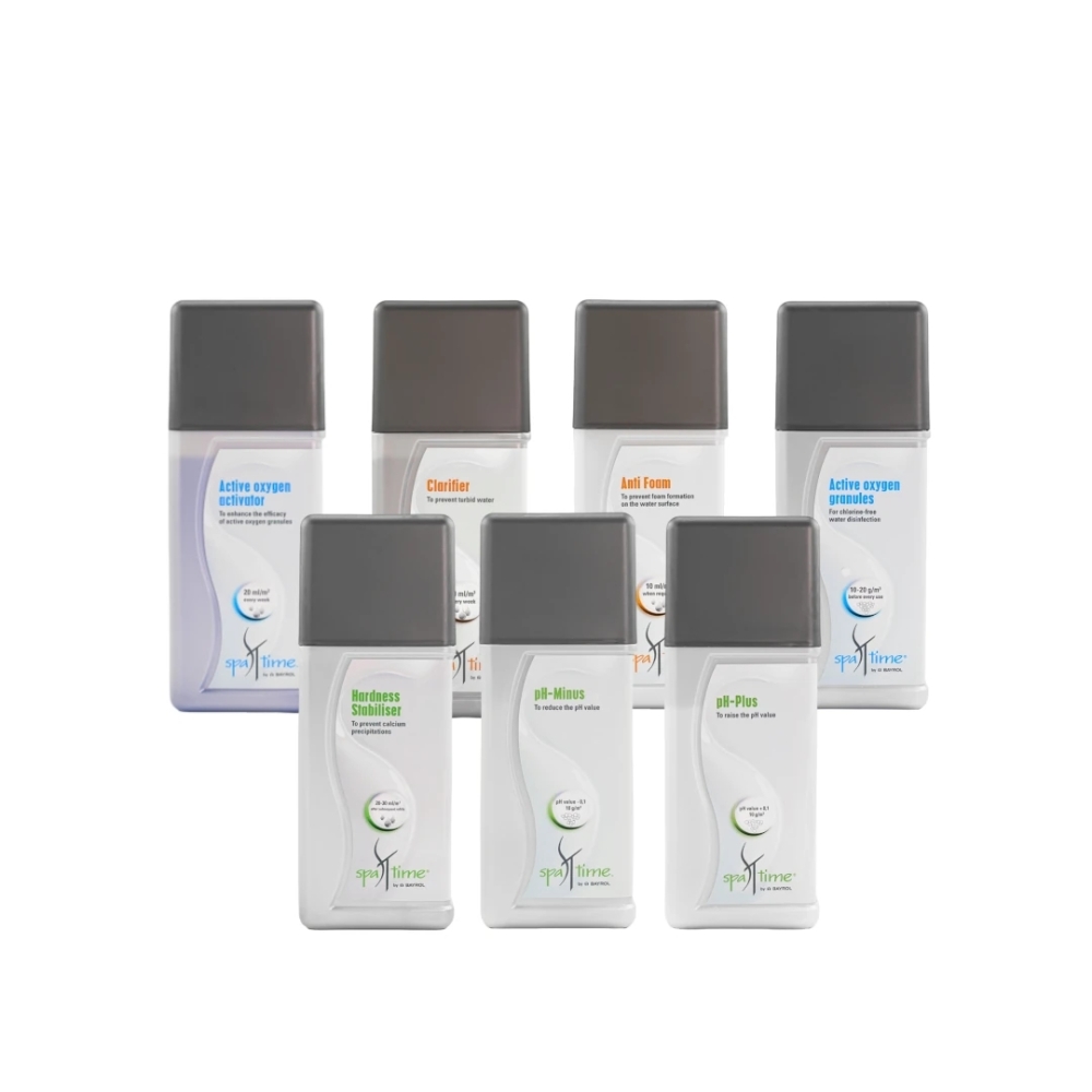 Ten zestaw chemii do jacuzzi SpaTime umożliwia prowadzenie wody w systemie bezchlorowym. SpaTime Active Oxygen odpowiada za właściwą dezynfekcję, a SpaTime Active Oxygen Activator wzmacnia jego działanie i stabilizuje proces utleniania zanieczyszczeń. Uzupełnieniem systemu są preparaty do korekty pH (Plus i Minus), Hardness Stabiliser ograniczający osadzanie się kamienia, Clarifier poprawiający przejrzystość wody oraz Anti Foam eliminujący nadmierne pienienie podczas hydromasażu.